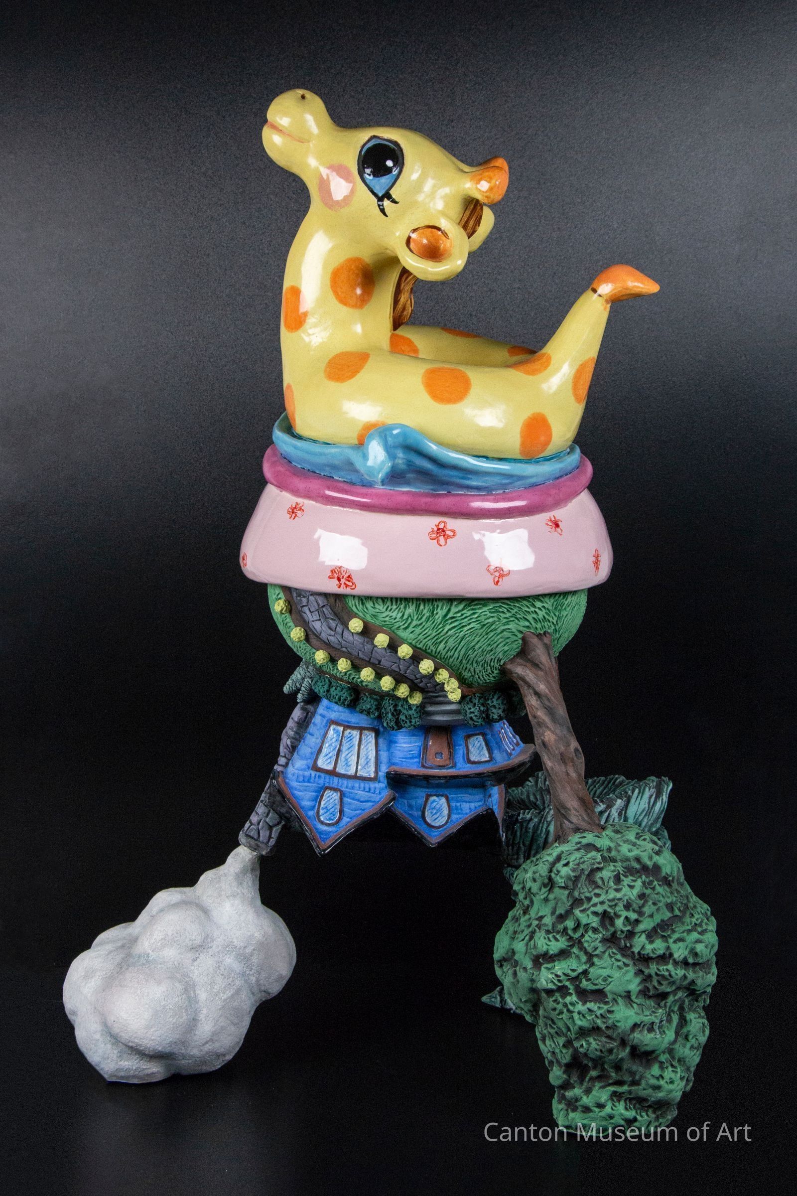 “Underwater” is a reaction to the housing crisis in Cleveland during the 90s for Cliffel. Kristen tells us “Unfortunately, it hit very close to home…our home in fact. We were facing several health crises in 2009 and ended up struggling with our mortgage. We tried to re-finance and found our home gravely ‘underwater’. I am however, the “Mommy” and leader of the family. I felt myself almost comically bright and buoyant to counteract the gravity of the situation we were faced with…I had been hit by a truck while walking that year and felt lucky to be alive yet challenged by many banal but critical details in life. Absurdity comes to the rescue! Giraffes have never been observed swimming and I thought it a fitting rescue toy to place in the swirling baby pool of life if you will… The home on the bottom is blue and heavy, yet well cared for and obviously loved. Juxtaposing not only color but images helps me to balance the good and the bad, the sweet and the salty, the joy and the heartache in this piece. I love the minute details of the home while the inflatable toy giraffe swirling carelessly around the top, ready to float away at any minute.”