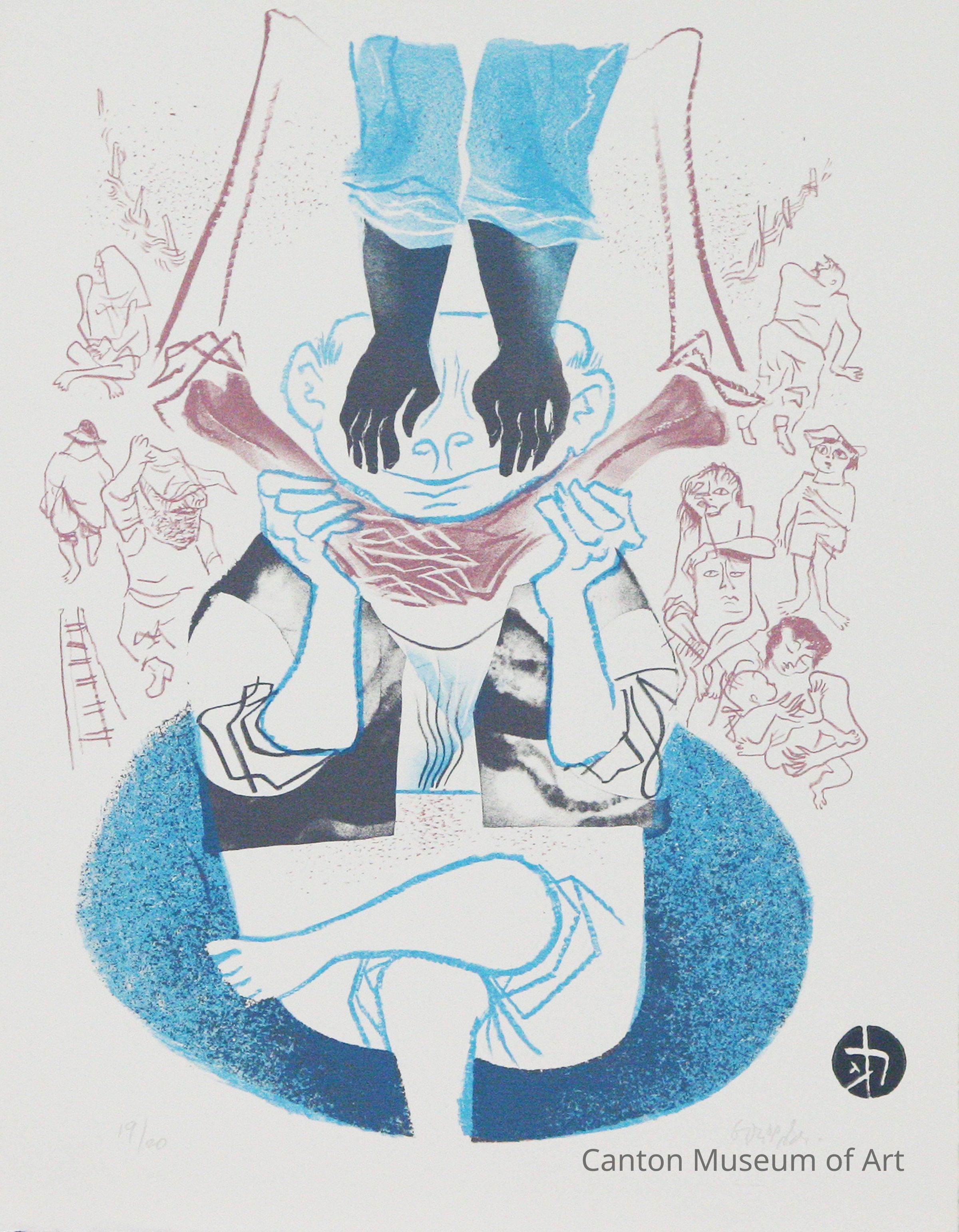 By the mid 1920s, William Gropper had established himself as a major satirical artist and lithography, silkscreening, and etching became one of his most potent weapons for launching his attacks against corporations and politics. His work focused on the common man, the human condition, and political injustices. Gropper’s parents were Jewish immigrants who worked in the sweatshops of New York City’s garment district. Their dignity in the face of hardship influenced their oldest son, who wrote, “I’m from the old school, defending the underdog.” Gropper’s "Unfinished Symphony Series" is one of many lithographs created in 1967 when he was a primary artist in residence at the prestigious Tamarind Lithography Workshop. When Tamarind opened in 1960, lithography was thought to be a dead art form, practiced by few printmakers. Tamarind revitalized lithography and guaranteed its future. Assisted by master printer Fred Genis, each "Symphony" lithograph bears the Tamarind Workshop blindstamp in the lower right margin. The "Unfinished Symphony Series" has a total of nine lithographs, of which the museum has eight.