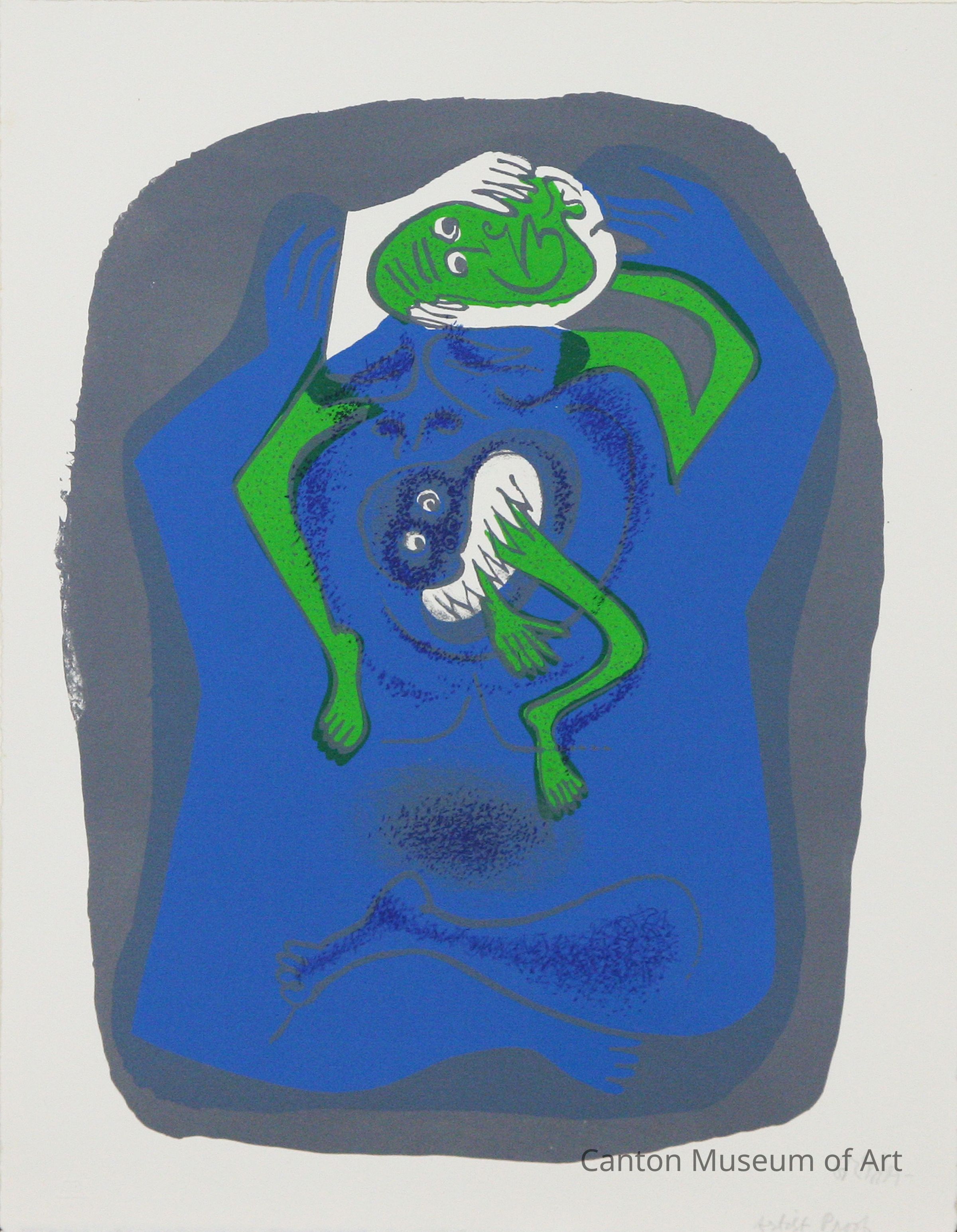 By the mid 1920s, William Gropper had established himself as a major satirical artist and lithography, silkscreening, and etching became one of his most potent weapons for launching his attacks against corporations and politics. His work focused on the common man, the human condition, and political injustices. Gropper’s parents were Jewish immigrants who worked in the sweatshops of New York City’s garment district. Their dignity in the face of hardship influenced their oldest son, who wrote, “I’m from the old school, defending the underdog.” Gropper’s "Unfinished Symphony Series" is one of many lithographs created in 1967 when he was a primary artist in residence at the prestigious Tamarind Lithography Workshop. When Tamarind opened in 1960, lithography was thought to be a dead art form, practiced by few printmakers. Tamarind revitalized lithography and guaranteed its future. Assisted by master printer Fred Genis, each "Symphony" lithograph bears the Tamarind Workshop blindstamp in the lower right margin. The "Unfinished Symphony Series" has a total of nine lithographs, of which the museum has eight.