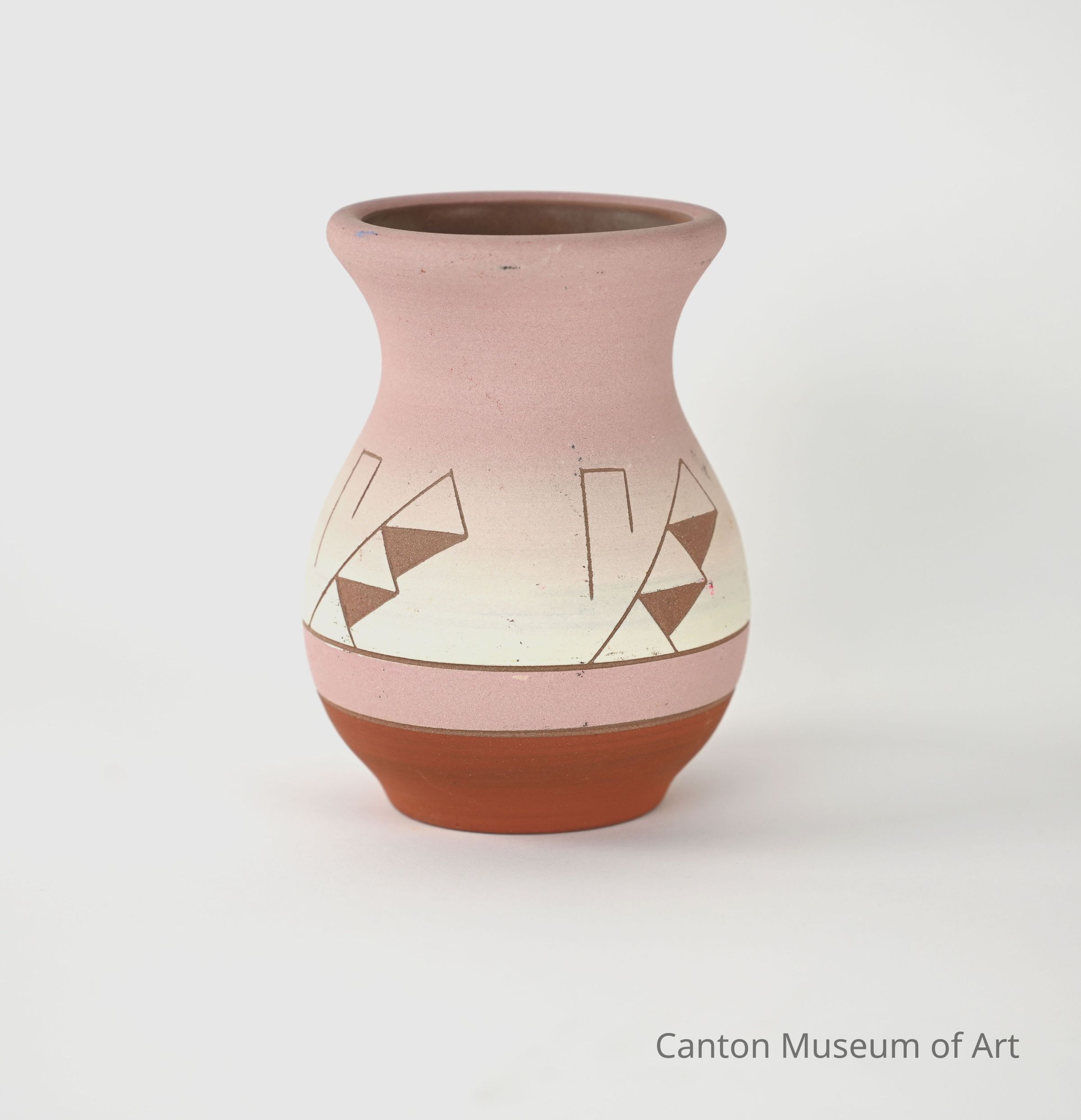 The Sioux tribe originates from South Dakota. Sioux potters are known for their elaborate freehand designs, specifically their use of shapes and patterns. Triangular designs are used in their art, as well as rainbow colors and symbolic designs.