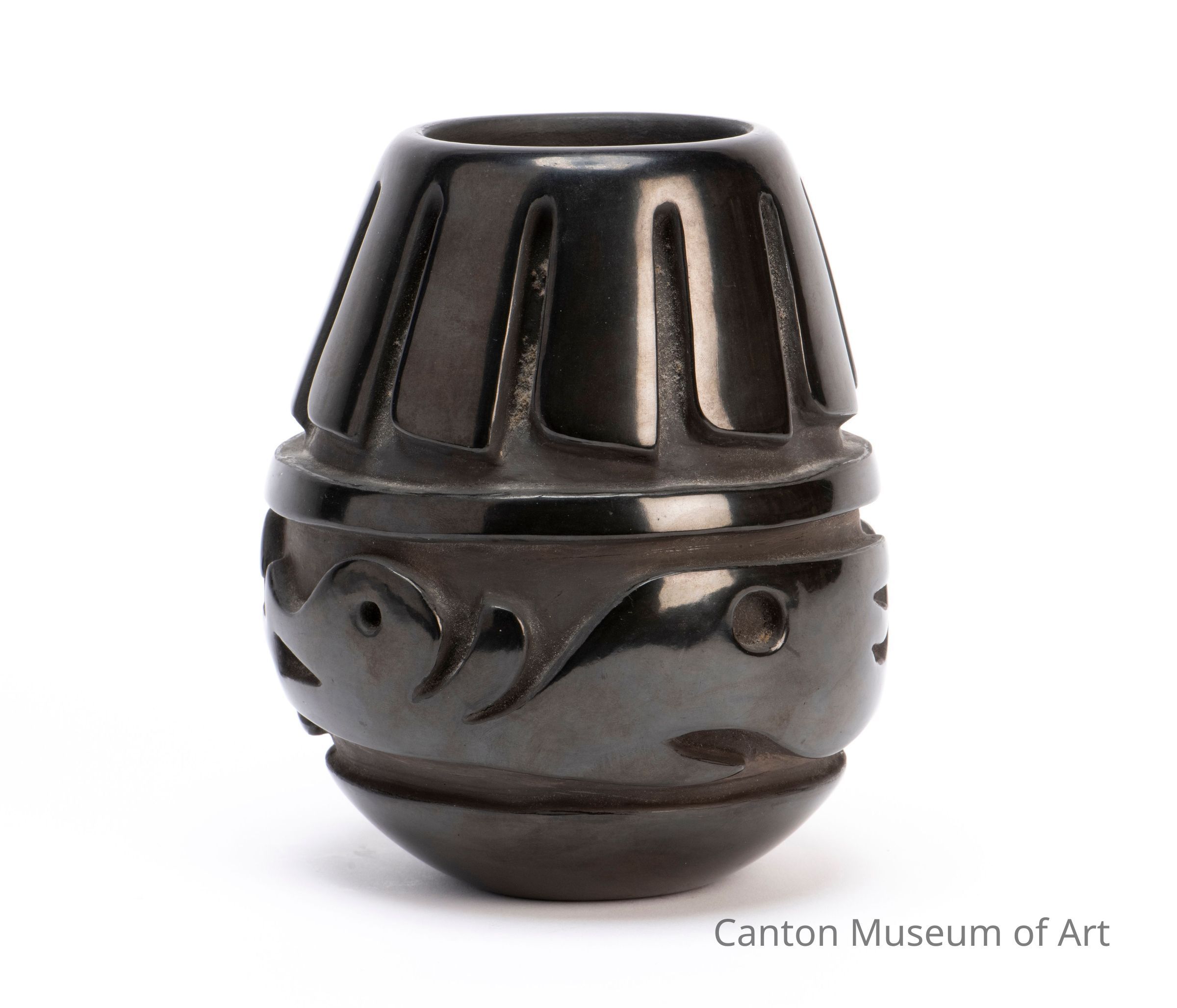 The Santa Clara Pueblo in New Mexico has a rich legacy of pottery-making and is home to one of the most vibrant communities of potters creating high-quality traditional vessels. Their handcrafted blackware and redware with intricate, deep engravings are one of the most widely collected forms of Pueblo pottery. Black pottery from the Santa Clara Pueblo in New Mexico is among the most well-known and has been produced since the late 10th century. The distinctive glossy black finish on Santa Clara Pueblo pottery is achieved by firing the work in a smothered fire. Many potters have a specific place they always travel to where they collect their clay by hand and search for the pumice that they will add to the clay to give it strength. Smooth stones that are passed down through the generations are often still used to smooth and shape the clay to the desired finish. Deep, engraved designs are distinct to Santa Clara, developed in the 1920s by famed pottery artist Margaret Tafoya and her mother Sara Fina Tafoya. The carvings are made in the clay while it is dry before firing and include designs like clouds and the famous Santa Clara bear paw.
