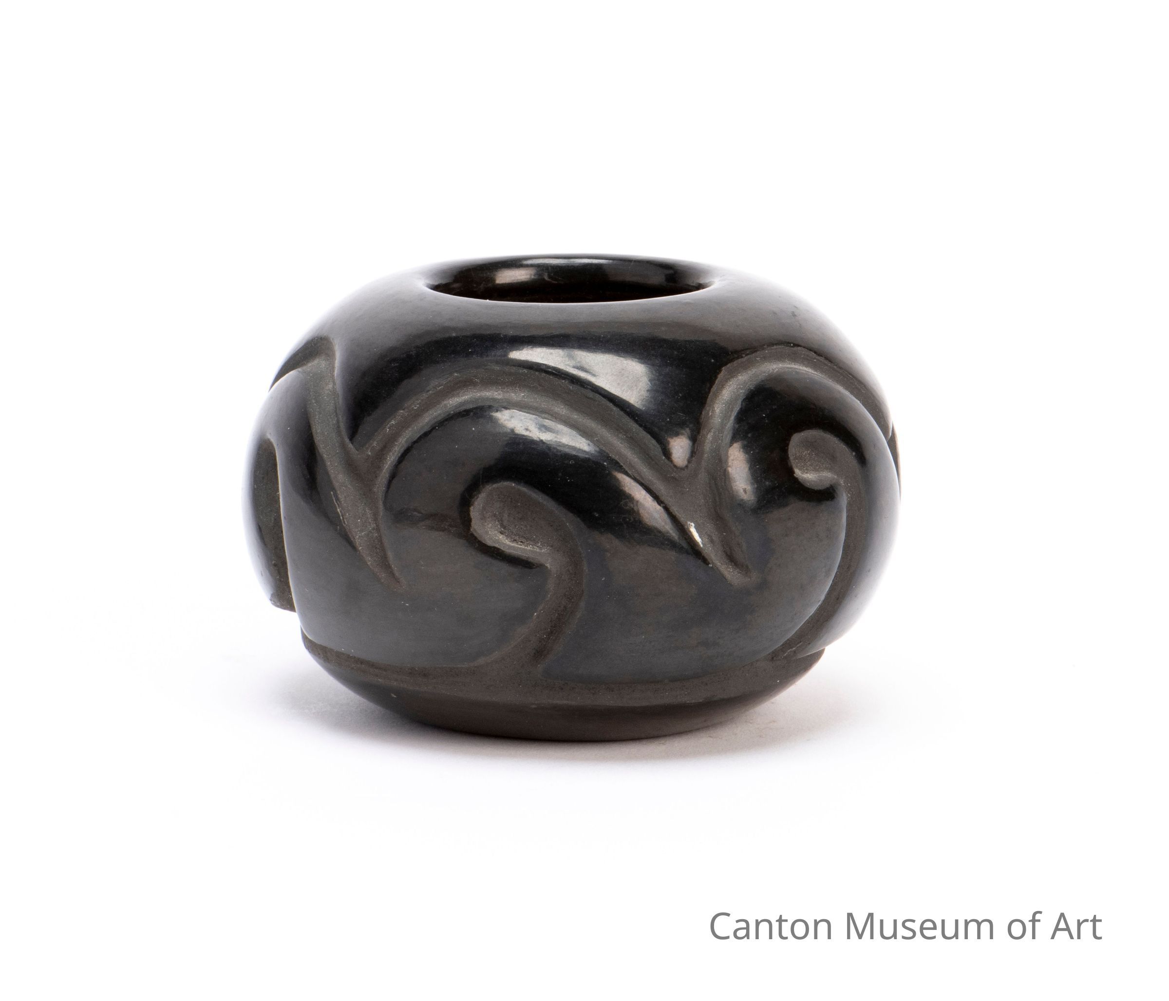 The Santa Clara Pueblo in New Mexico has a rich legacy of pottery-making and is home to one of the most vibrant communities of potters creating high-quality traditional vessels. Their handcrafted blackware and redware with intricate, deep engravings are one of the most widely collected forms of Pueblo pottery. Black pottery from the Santa Clara Pueblo in New Mexico is among the most well-known and has been produced since the late 10th century. The distinctive glossy black finish on Santa Clara Pueblo pottery is achieved by firing the work in a smothered fire. Many potters have a specific place they always travel to where they collect their clay by hand and search for the pumice that they will add to the clay to give it strength. Smooth stones that are passed down through the generations are often still used to smooth and shape the clay to the desired finish. Deep, engraved designs are distinct to Santa Clara, developed in the 1920s by famed pottery artist Margaret Tafoya and her mother Sara Fina Tafoya. The carvings are made in the clay while it is dry before firing and include designs like clouds and the famous Santa Clara bear paw.