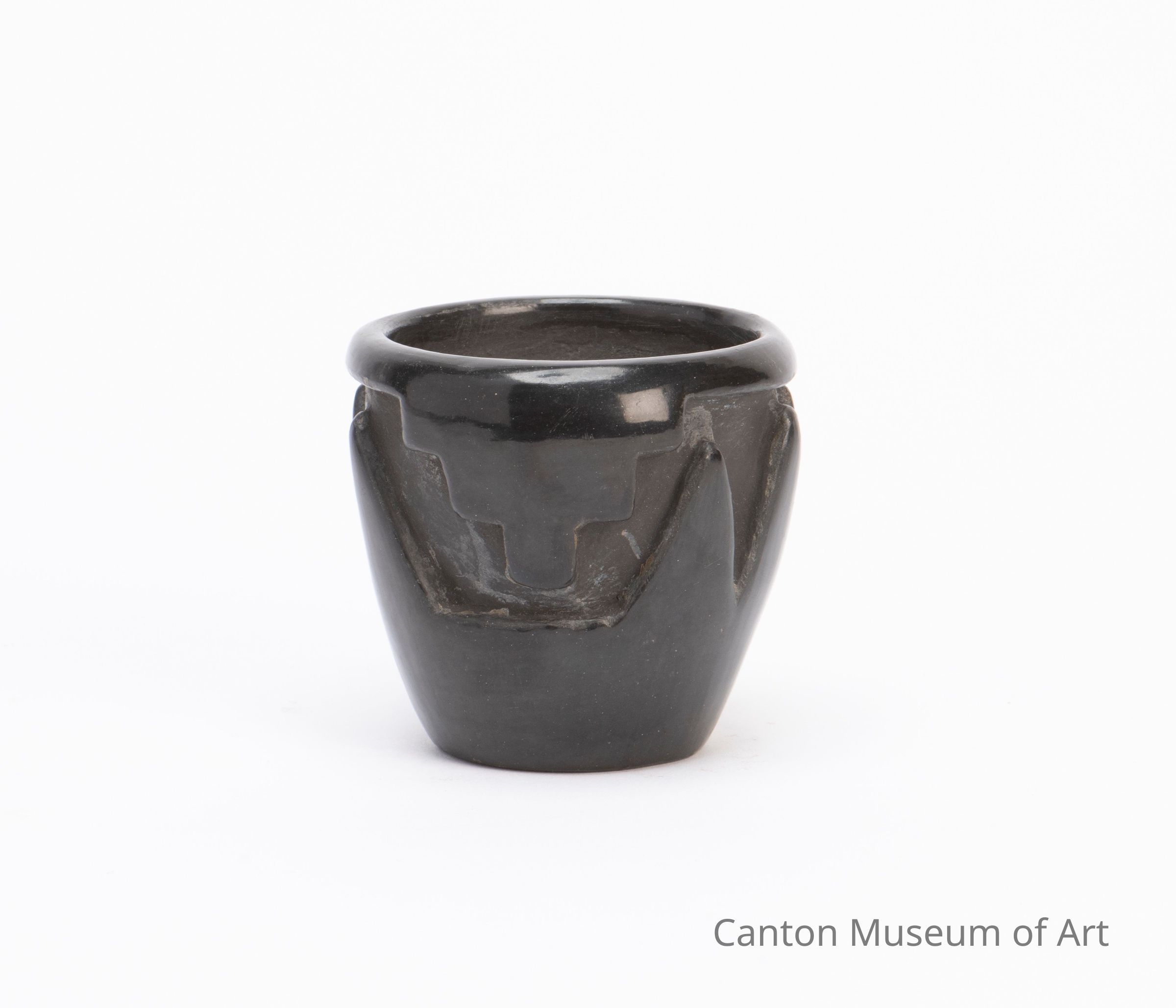 Though the artist is unknown, this work is unmistakably from the The Santa Clara Pueblo in New Mexico, known for their glossy black pottery and representational designs. This Pueblo has a rich legacy of pottery-making and is home to one of the most vibrant communities of potters creating high-quality, traditional vessels. Their handcrafted blackware is among the most well-known and has been produced since the late 10th century, pioneered by Maria Martinez. Many Santa Clara potters have a specific place at the Pueblo they always travel to where they collect their clay by hand and search for the pumice that they will add to the clay to give it strength. Smooth stones that are passed down through the generations are often still used to smooth and shape the clay. Designs are painted on before firing, traditionally with a brush fashioned from yucca fiber and paint derived from plants and minerals. Designs are based on abstract representations of clouds, rain, feathers, birds, plants, animals, and other natural world features. The distinctive glossy black finish is achieved by firing the work in a smothered fire.