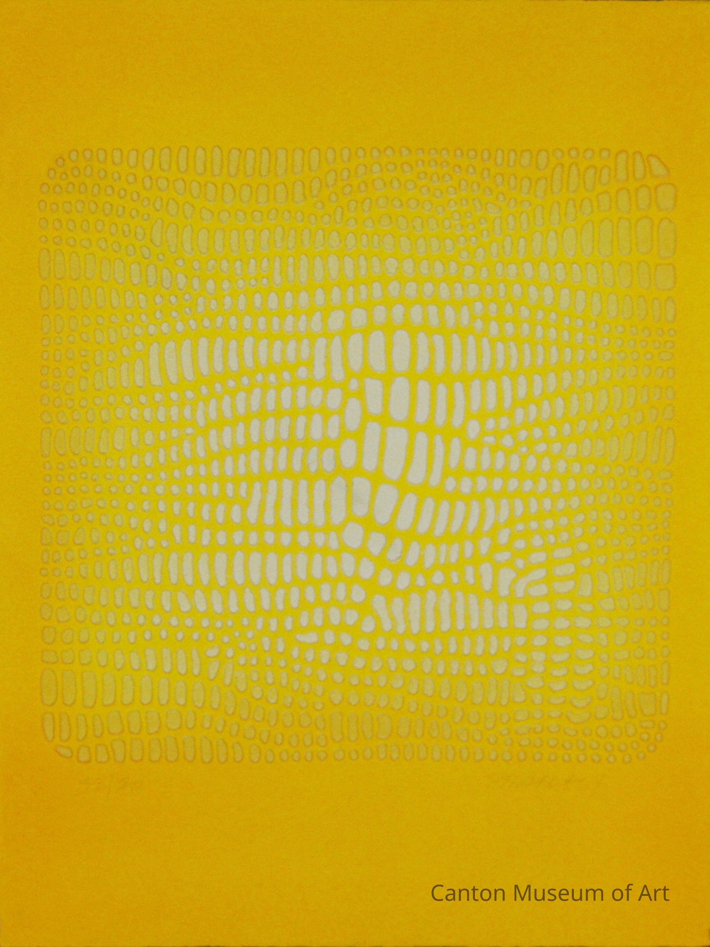 Overtones of a metaphysical nature seem to emanate from Maxwell’s work. This piece culminates into a crescendo of pale yellow and large ‘scales’ in the center. The monochromatic yellow of the work conveys cheerful optimism while the structured evolution of the scale-shapes illustrate movement and change.
