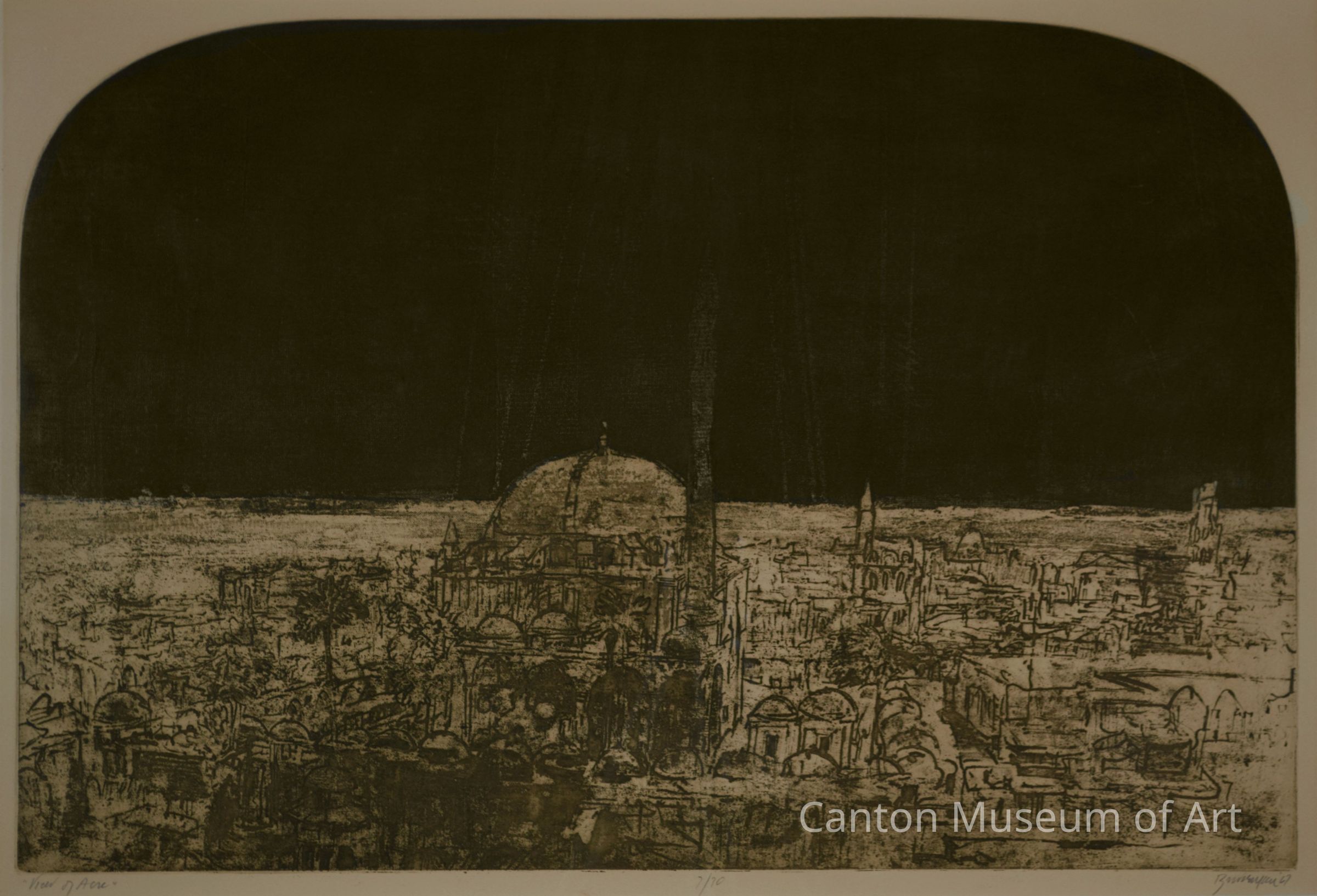 Acre (ah’kur or a’kur) is a city of great antiquity at the foot of Mt. Carmel in Palestine. In medieval times, it was a place of great importance, being the key to the Holy Land, and as a result it is famous for many sieges and underwent frequent destruction. Little of interest now remains. A mosque left of center in this etching creates most of the visual interest and drives home the nature of the city of Acre.