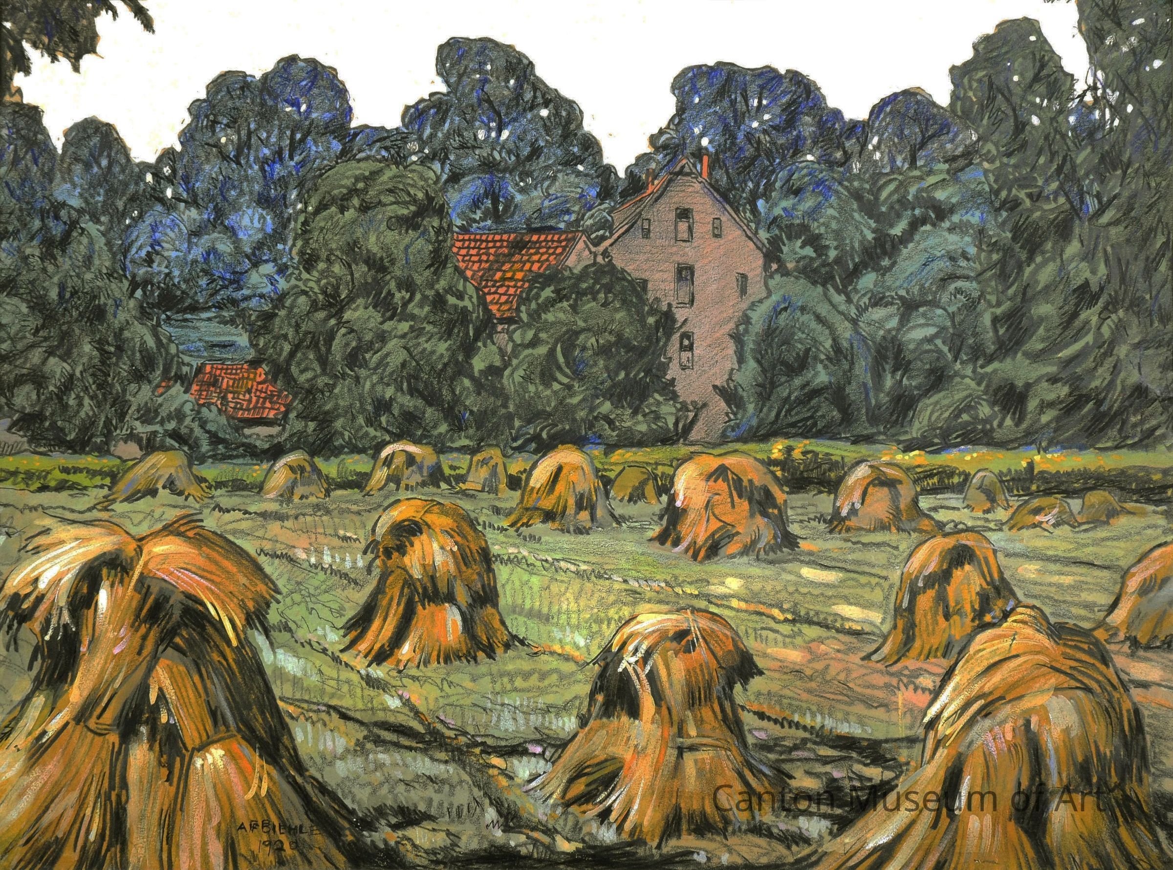 As a person of German heritage, Biehle had an interest in capturing locations that had been important to the lives of the Germans who had settled there, including Zoar. Biehle was one of many Cleveland artists who visited Zoar as a respite from the industrial city. Zoar was established in 1817 as a communal settlement by German Separatists seeking religious freedom, a history which appealed to Biehle. The house in "Wheatfield in Zoar," with its unique red clay-tiled roof reminiscent of houses in Germany, is a great example of this.