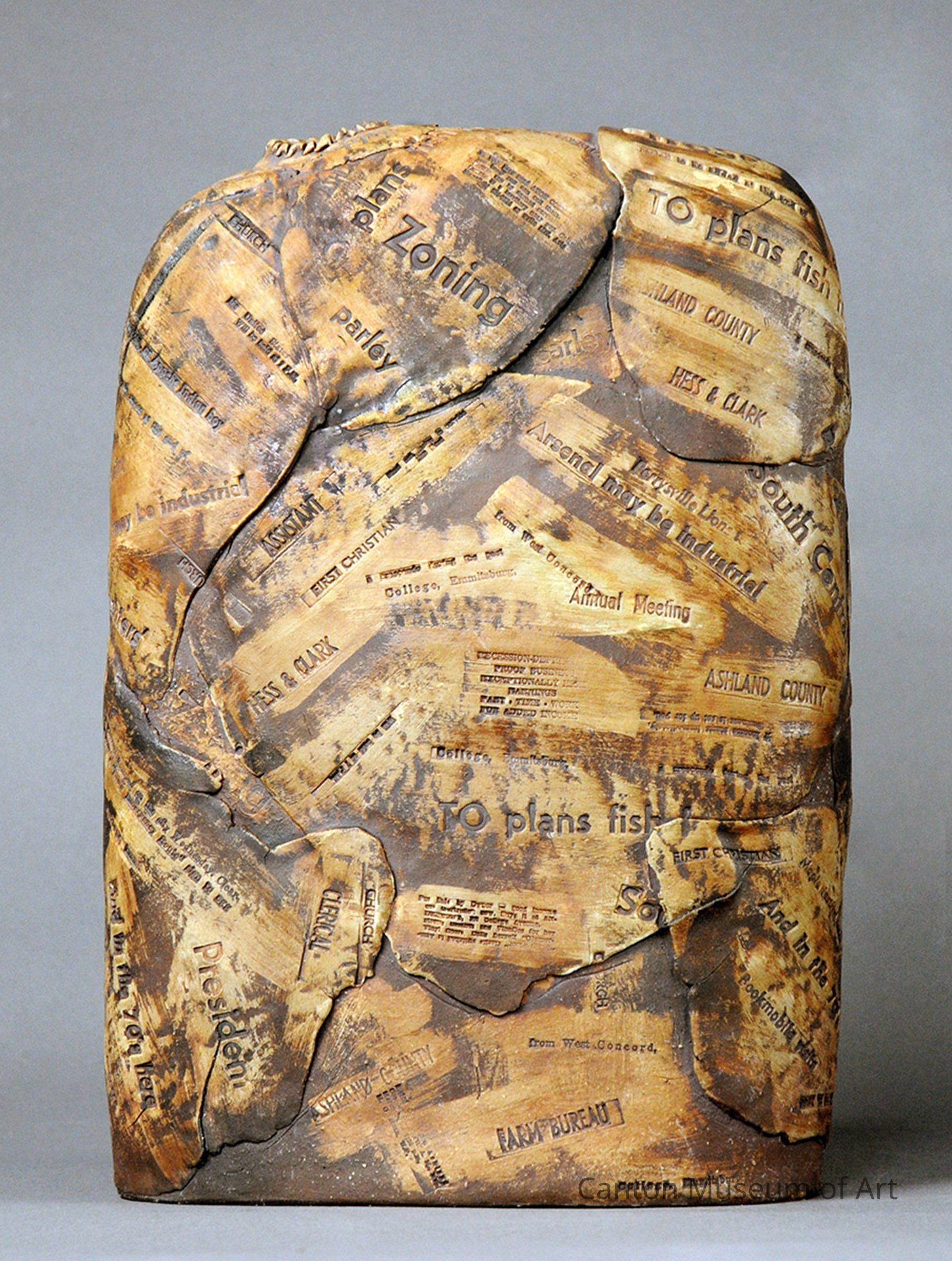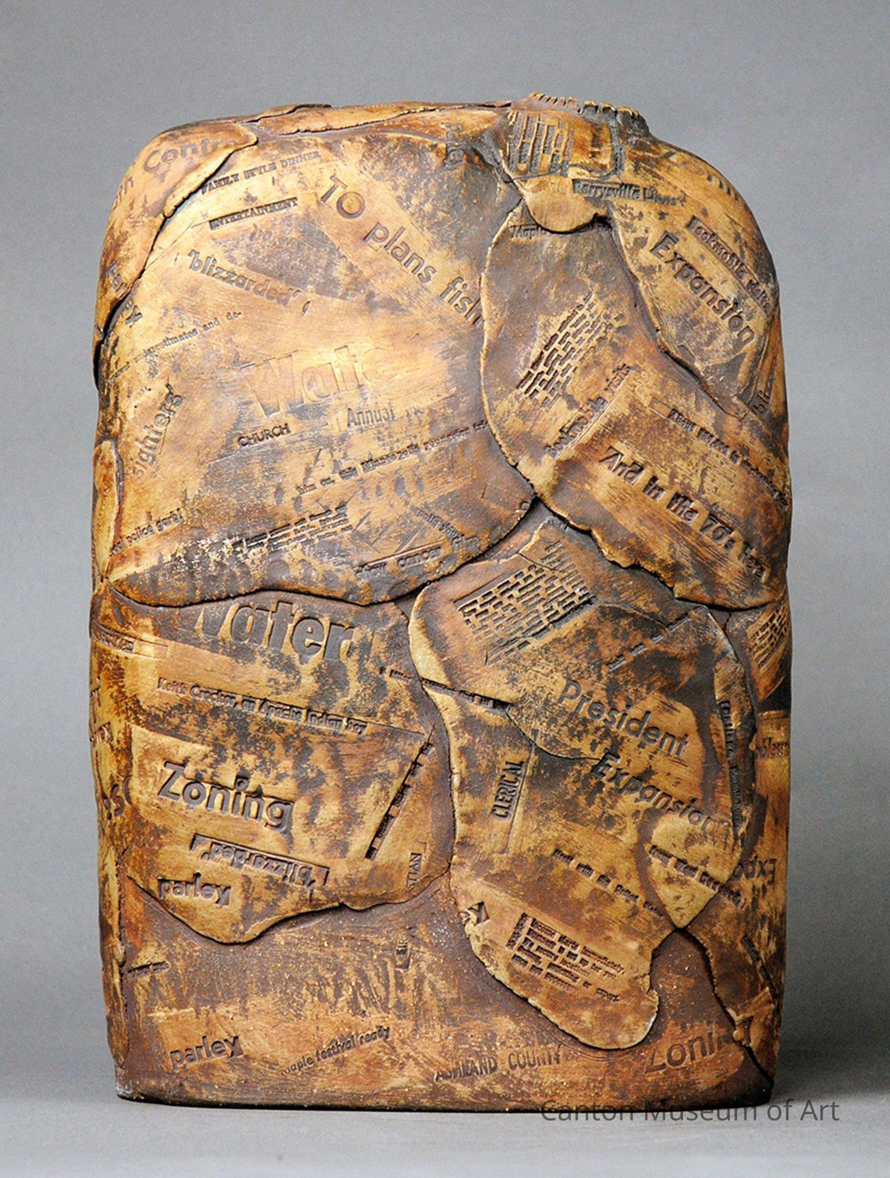 "Word Pot" contains the words “president,” “zoning plans,” and “bureau,” seemingly shown in newspaper clippings. Made in 1967, the time of numerous political issues and unrest, it fits that this piece would be a critique of governmental issues.