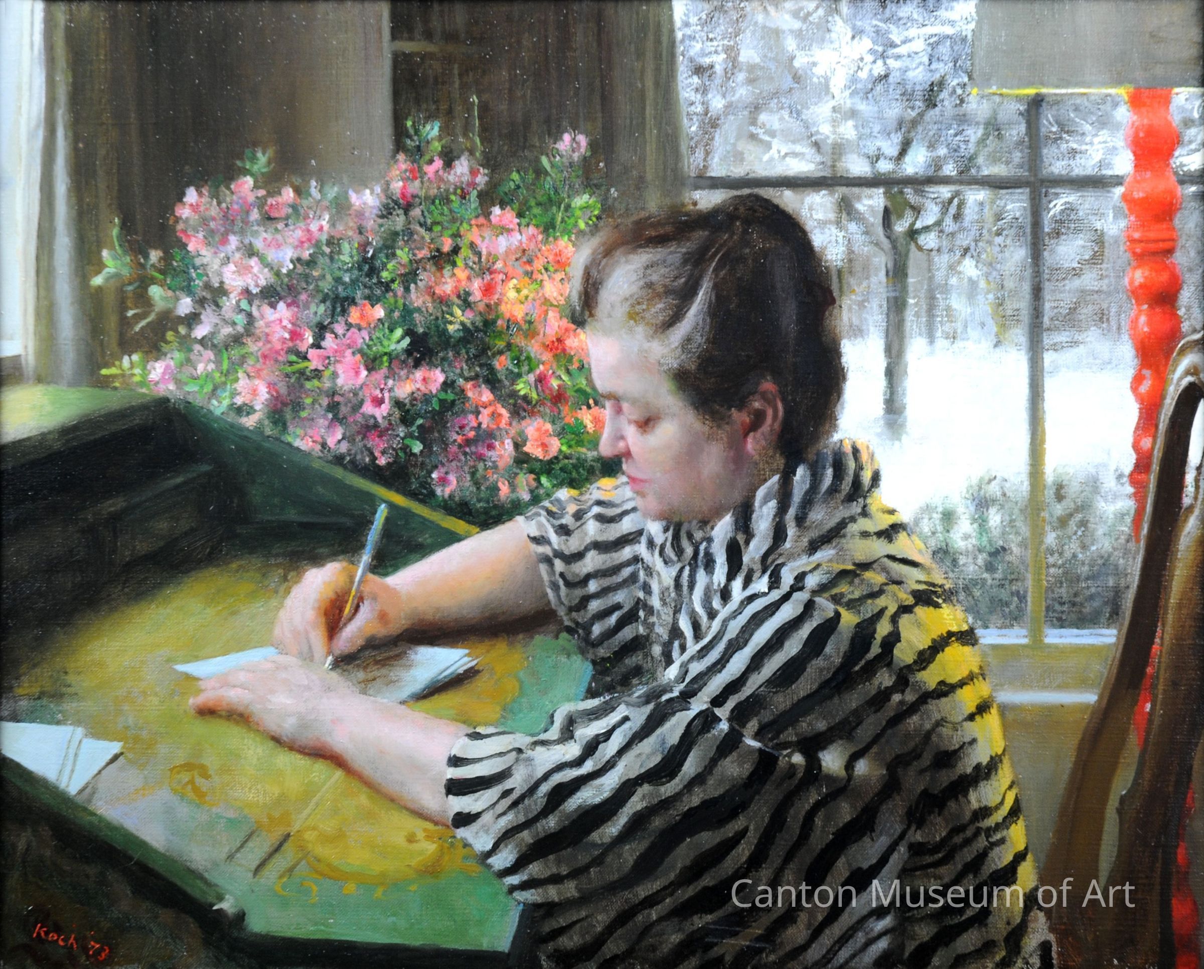 There is a warmth in this scene that is balanced with a chilling cold - the bold splashes of the pink floral bouquet and the warm light on Mrs. Koch’s back contrasts with a window that peers outside at the snow-covered trees and plants, buried deep in the white flakes.