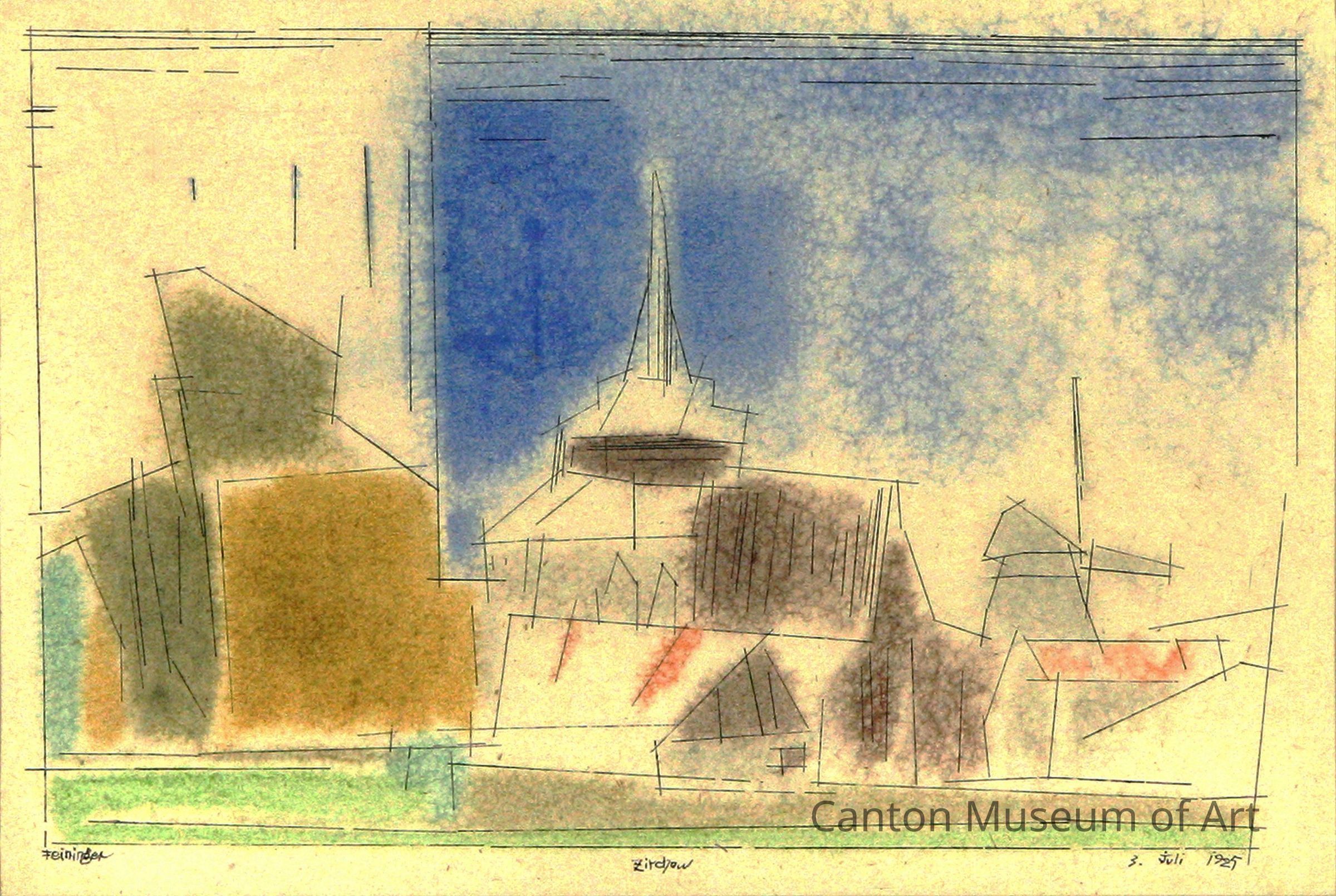 An obsessive draftsman, Feininger made thousands of sketches from nature, which he would then combine to create a final composition. In his landscapes, Feininger fused traditional subject matter with influences of modern art movements, creating his own distinctive style. In "Zirchow," Feininger's distinctive style is evident, featuring cubist elements, expressive washes of color, and blocky geometric shapes.