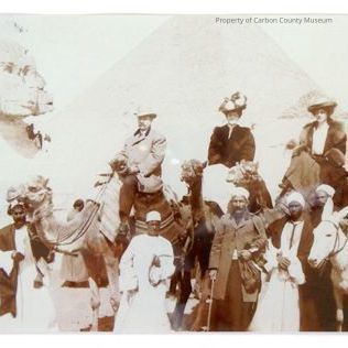 Black and white photo copy of an older photo of 3 people on camels, one man on a donkey and several men standing. In the background is the head of the Sphinx and a pyramid of Egypt. Written on the back in black ink: "On camels L-R: Unidentified man, unidentified woman, and Selina (Mrs. John) Osborne-to-be on world tour where they met (1906). Photo courtesy of Hugh Ridenour and Adsmore Museum of Princeton, KY.Collection