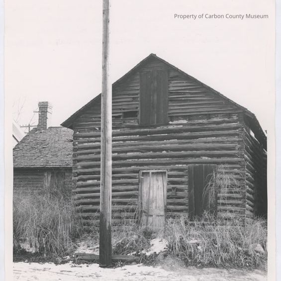 Printed on the back in blue ink: "No 178 Catalogue No1. U.P.R.R. public relations" "Old log house still standing in Rawlins, Wyo. Just off Highway 30 on Cedar St. Has not been occupied for many years. It was built by William Heath in 1878 and was made from old discarded telegraph poles. The Heaths lived here for a year and a half while Mr. Heath built the log house on Cedar St. where his daughter Mrs. Lillian Heath Nelson still lives in 1952." "Duplicate mounted." "page 51 pix 1 3 1/2 x 3 1/2 Neg No 6666".
