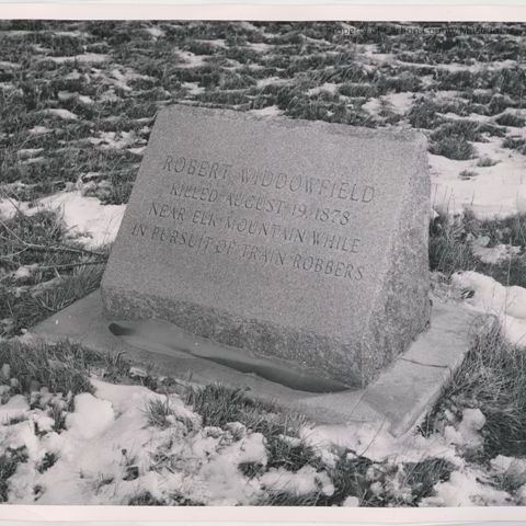 Update 2/2008: Black and white print. Snapshot. Image of a stone gravemarker in a snowy lawn. Carved on the rectangular polished face: "Robert Widdowfield killed August 19, 1878 near Elk Mountain while in pursuit of Train Robbers".