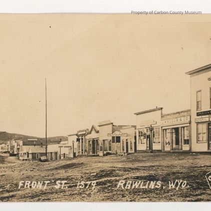 Written on bottom of original negative: "Front St. 1879 Rawlins, Wyo [inside square] Copy by Meyers"
