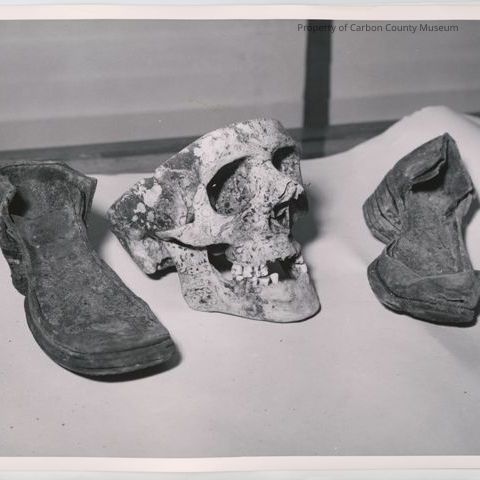 1. Written on the back in blue ink:" U.P. Public Relations[.] the lower part of Big Nose George's skull and the leather shoes or boots which were cut off his feet after he was hung in Rawlins March 26, 1881 for trying to rob a train and his gang killing two men."