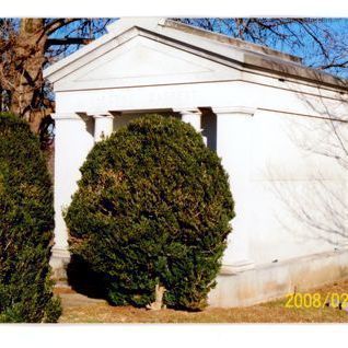 Color photograph of a white marble mausoleum with a trimmed cedar tree in front of the entrance and another to the left side of the photograph. The photo has a yellow date 2008/02/10 imprinted on the front. Written on the back in black ink: "Mausoleum in Princeton, KY., where Dr. John and Mrs. Osborne (Selina Smith) are interred-Cedar Hill Cemetery. Photo courtesy of Hugh Ridenour and Adsmore Museum of Princeton, KY."Collection
