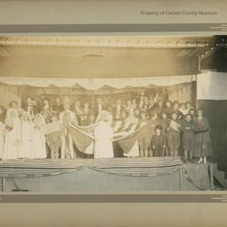 Black & white print on two toned tan mat. Image of a large group of men, women & children in costume on a stage. A banner with American flags is across the front of the stage. Steps to stage are on photo right. Costumes are of a patriotic theme. Man in striped suit & top hat, girls in nurses uniforms, soldiers uniforms, nicely dressed men & women & two black waiters. Scene may depict the grand finale of a play performance.