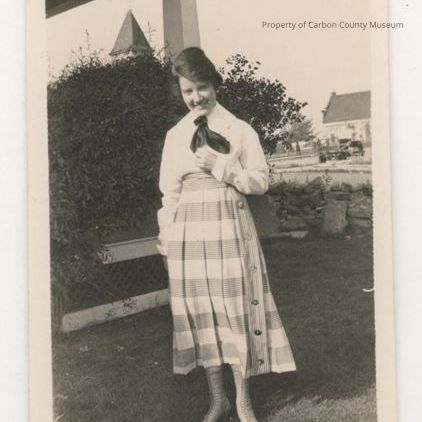 Update - June 2010: black &white print. Snapshot. Image of a young woman dressed in plaid skirt, white long sleeved shirt, dark scarf tie & high lace up boots. She is standing in a grassy yard next to a porch. bushes, street & buildings in background.