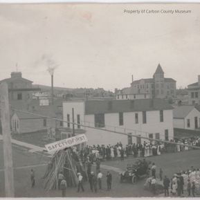 A black and white unused postcard print of early day Rawlins downtown, showing a street with a wooden teepee shaped bonfire stack with a long horizontal sign on top that reads: U. P. Hose Co. No. 2 Safety first. This display is located at a street intersection. There are large groups of people on both sides of the road. They are dressed in vintage clothing. An early day open automobile is parked in the middle of the street facing the bonfire stack. A small number of men are standing near the stack and another man is standing on an unseen object working at the top of the display. The original Carbon County Courthouse is seen at background left, and Central School is seen at distance side right. Elks stone building is on side right center. An electrical pole is at side left foregriound with a thick line extending across photo to side right in foreground. Written on back in blue ink: Dall Williams