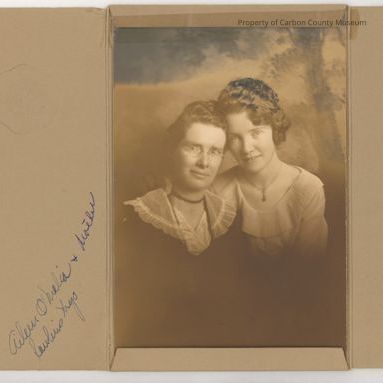 Update - June 2010: Sepia print. Studio pose. Mounted in tan paperboard folder. Half-length portrait of two women. Woman on left is wearing a dark dress with sheer white ruffled collar; her hair is pinned up & she is wearing rimless glasses & a double strand of dark beads. Woman on right is wearing light colored dress with ruffled collar; her hair is pinned up & she is wearing a pendant necklace. Painted backdrop behind.