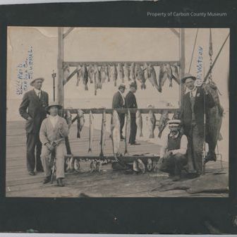 Black & white print on black mat. Image of six men on a wood dock & a rack with many fish hanging on rack. A very large fish is hanging from a chain & pulley on photo right & another lay on the dock. Written in white on original negative: "Our catch July 17, 1909 Captain Golding" Written in blue ink by men: "Will Reid Carbon Journal, C. R. Watson" Engraved in lower right corner: "Reyes Catalina Island, Cal."