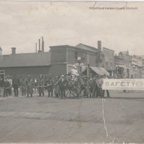 A black and white unused postcard print showing a group of firemen and men standing in a roadway and holding onto an extended firehose in a horizontal line from a push hosecart that has two large wheels (they are as high as the men). The firemen are wearing medium colored firecoats and firemen style hats with short front bill and large back brim and high crowns. Vintage wooden downtown buildings are seen in background on side left. A building in the center has an U. S. flag hanging vertically from the upper edge of the roof down the front of the store. Men are standing by the hose cart wheels and two on the right are holding the side right of a large white rectangular sign that reads U. P. Hose Co. No. 2 Safety First with a logo between the words at the sign center. Two other men are standing at the opposite side and are holding the extended side left of sign. Two small girls dressed in white are standing on top of the firehose cart. Other people are seen in photo background behind the cart and sign.