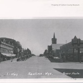 A black and white scanned copy of a Rawlin's downtown street scene at the intersection of the east corners of Cedar and 4th Streets, ca. 1920's. H. Hansen building on left (Cullen Commercial Co.) Rasmussen's building on right (Furniture/Funeral Parlor). H. Hansen building was designed by Charles Anderson Hansen. It was built of Rawlins pressed brick . Street post lamps are seen along sidewalk edges. Vintage autos are parked at an angle on both sides of the street facing buildings. The spire of the Presbyterian Church is seen at background side right. Good condition. Newly scanned. Scan is from a postcard image and appears pixalated with small dark dots. Image is not very sharp, since it has beeen enlarged from the original size. Writin in black on back impacts top surface at right corner.Collection