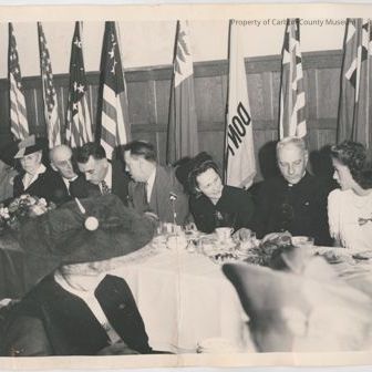 Black & white glossy print. Image of a row of people at a dining table filled with dishes & food. On far left & continuing right are a man in uniform, older lady with hat, older man & two more men in suits, another lady with hat, a clergy man & a lady. Eight flags are hanging down around poles behind them. In foreground is another lady in a large brimmed black hat.
