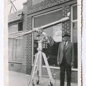 A black and white snapshot with scalloped edges of D.C. Kinnaman standing on a sidewalk in front of a brick store building with large plate glass show window behind him and to his left . A large telescope mounted on tripod type legs which has both rolling wheels and mounts for stabilizing base. Mr. Kinnaman is wearing dark trousers, medium color vest, and jacket, white shirt and black tie. He wears a medium shade brimmed hat.