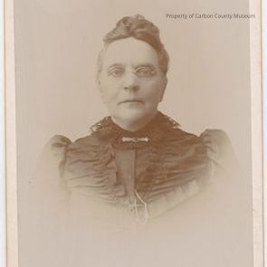 Black & white studio portrait on white mat. Image of head & shoulders of a woman. She wears a dark dress with puckered bodice & lace collar. A brooch is attached to collar at neck & she has on a chin necklace with a cross. Her hair is pulled to the top of her head in a couple of curls & she has on wire rimmed glasses. Printed in green on bottom: "Brown A. A. Rawlins, Wyo."