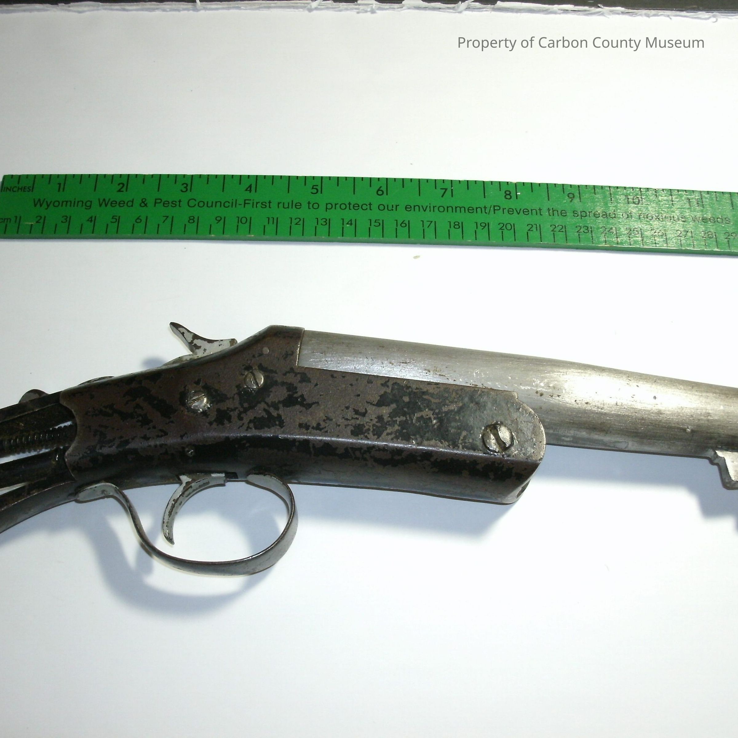 A sawed off shotgun 12 inches in total length. Missing the handle grip. Shotgun modified with a very short barrel. Lettering on side of gun stock "Riverside Arms Co. Chicopee Falls Mass. USA." Letters and numbers on bottom of barrel "GV 273". Barrel very shiny silver metal. Stock has wear from black to metal. There are gold patches on back side of grip area with a hole in very back of stock grip probably to attach stock. Silver trigger and lock. Originally found by owner in father's shed in Rawlins. Father is Coy Girardot. Was turned over to the Rawlins Police Department as it is an illegal weapon. Officer T. Dregne of the Rawlins PD brought the gun to the museum to see if we wanted it as opposed to them destroying it. We accepted the gun and the original owner came down and signed for it. Condition fair. Missing stock. Some repair work needed. Research shows it was made for protection. A weapon of choice for Scillion (Sicilian?) Mafia. Our historian Rans Baker, a gunsmith, also made several but with legal barrel length.Collection