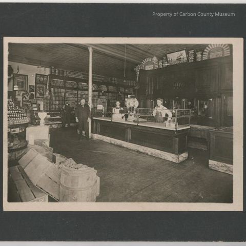 Update - 2009: Black & white print. Snapshot. Mounted on black matboard. Image of the interior of a grocery store. Crates & barrels of produce on left foreground. Canned goods on display in left background. Glass display cases & floor to ceiling shelves with merchandise along back wall. Meat counter through center. Four men in view - 2 behind meat counter in shirt sleeves & aprons; 1 in front of counter at center in a dark suit & hat; fourth man in background leaning on display case - he is also in shirt-sleeves & appears to be an employee. Hardwood floors & patterned ceiling.