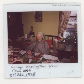 A colored polaroid snapshot of an older gray haired man is sitting at a kitchen table laden with pies, jars, and Christmas placemats. He has a brown coffee cup near his right hand which is resting on his placemat. He is wearing a long sleeved gray shirt. A window is seen behind him showing a snowy outdoors scene with a pickup in the driveway. Written on the font lowe margin in black ink: George Washington Dew 5 May, 1870-25 Dec 1978. A candlestick telephone and a dial phone are seen on a background table. Good condition. Ink on front is smeared. There is minor wear on edges, and a few scratches on print surface. Back side is black due to the polaroid process.Collection