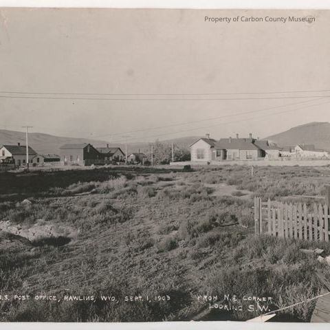 1. One 6 1/2 x 8 1/2 original; two 3 1/2 x 4 7/8 copy prints; one 8 x 10 copy print. Image of the property prior to ground breaking, empty lot with picket fence in right foreground; houses and hills in background. Written on original negative at bottom edge: "U.S. Post Office, Rawlins, Wyo, Sept. 1, 1909" "From N.E. Corner Looking S.W."