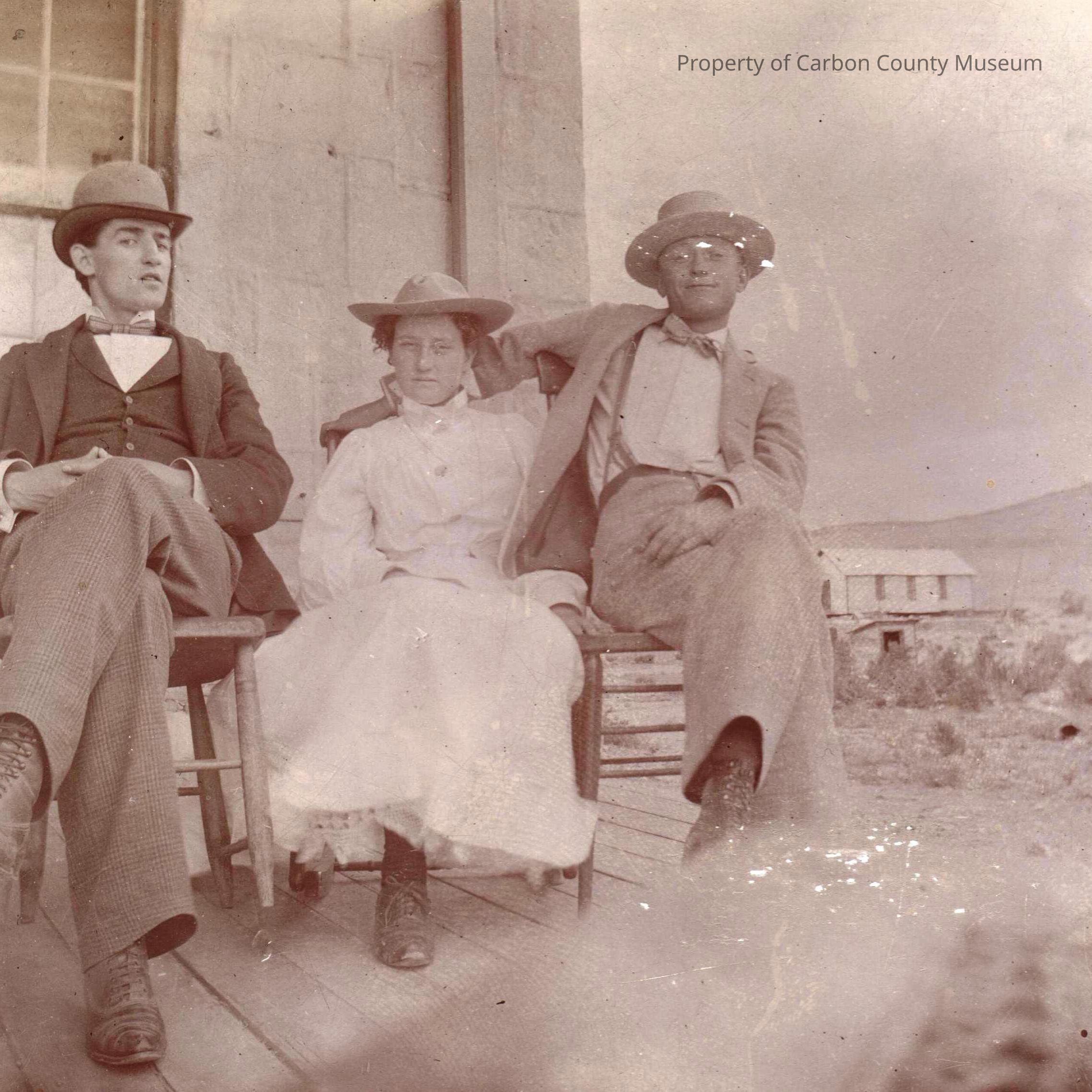 Black & white print on white mat. Image of two men & a woman, sitting on chairs on an open porch. Man on left is wearing a dark jacket, vest, white shirt, bow tie, medium colored pants & derby hat. Woman has on white frilly dress with high neck & large buttons down the front, dark shoes & a curved brim hat. Man on right has on a light colored jacket, pants, suspenders, dark shoes & a flat brimmed straw hat. Buildings are seen in the distance. Front right of photo is blurred. Edges of print are black.