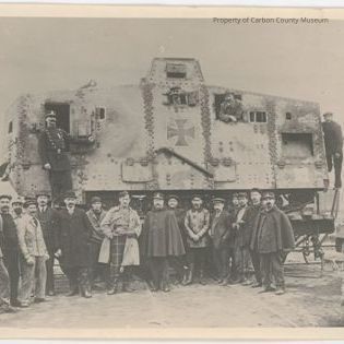 Black & white print of a WW I tank with soldiers of several countrys standing in front. A group of about 18 men are dressed in warm clothing, one in large plaid pants & several in capes. Four more men are on & in the tank. Tank is large metal, riveted together & has a Maltese Cross insignia on the side. It has doors or windows that open out where two men are looking from them. This picture was victory card from WW I & were brought home as souvenirs of captured equipment. This may have been in southern France.