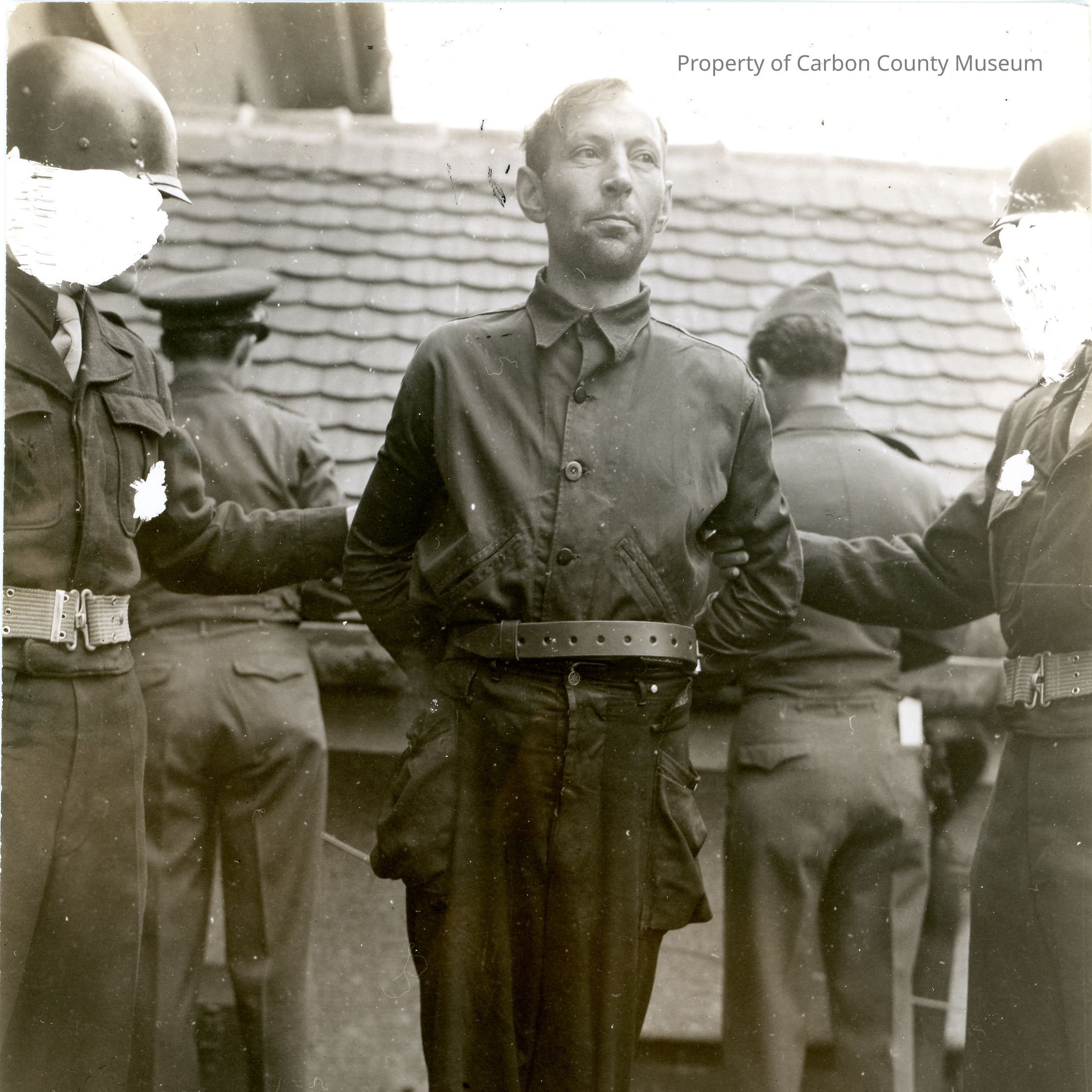 A black and white photograph of a man wearing a prisoner uniform, he is being held in place by two men wearing military uniforms - their faces and rank have been scratched out. Behind the three are two men in military uniform with their backs to the camera. Text on the back of the photograph reads "Tremmel, Paul Exec WCPL 5 Nov 48".