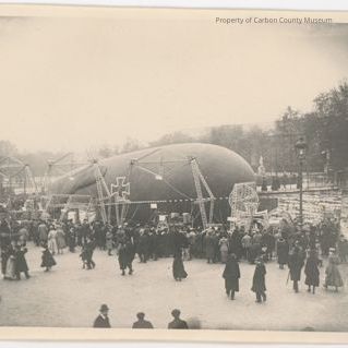 Black & white print of a blimp from WW I. It is setting on the ground with mesh, metal braces around to hold in place. There is a Maltese Cross on side & front. A crowd of people are walking about looking at what may have been an observation balloon. This picture was a victory card from WW I & was brought home as souvenirs of captured equipment.