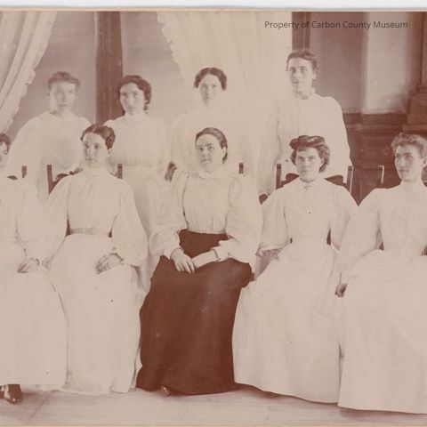 Sepia print. Mounted on tan matboard. Image of nine women seated and standing in front of a large window. 8 of the women are dressed in long white long-sleeve dresses; woman in center front row dressed in long dark skirt and long-sleeved white blouse.