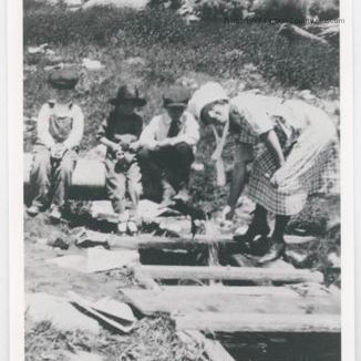Snapshot. Image of a woman & three children at the outlet of a small water pipe. Children are sitting on a log above the pipe. Woman dressed in short checkered dress & sunbonnet, is leaning over holding a glass in the water stream. Wood sided ditch collects the water & transports it; planks of wood over ditch top. Scrub-covered hill in background. Written on back in pencil: Smiley Springs? Grace, Billy & Cora Foster. (Note: we have multiple copies of this photo under number 2008.1008.1.452). This is most likely Smiley Springs West of Rawlins in the Rawlins Country Club area and not Rawlins Springs.Collection