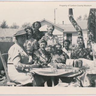 Small black and white print of a group of 8 women outside around a table. Woman on left is wearing a hate and a white long sleeved dress. Other women have hair pulled up and are in patterned dresses. A white house is in background along with a wooden fence. Written on the back in black ink:"1. Ruby Cornwell (front)-2Keldsen, 3 Sis 4 & Trin Rankin? Back 1. Grace Foster, 2 Meta Lahrman, 3 Edna Goad, 4 Edith Sorenson. Photo in good condition. Writing on back affecting emulsion.Collection