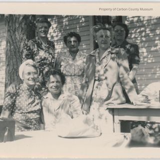 Small black and white print of 6 ladies outside a house. Two are sitting and three standing. One on the left has white scarf tied over hair. All are in dresses. One has a jacket over her dress. There is a box camera and a white purse on the table in front. Written on the back in black ink: "Mother-Keldsen-Edna Goad, Meta Lahrman. Photo in good condition. Writing on back affecting emulsion. Scratches.Collection