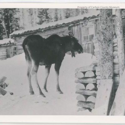 Written in blue ink on back: "Moose at Canyon Creek Camp Wind River Mts. I lived in log cabin in background at the time this picture was taken. Curly Corbin[.]