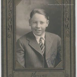 Small black and white portrait print in a gray tri-fold case with a gray mat with scroll work on top. Print of a young man with a suit coat and striped tie on. His hair is combed back. Written on the bottom right edge of photo in blue ink: "James Cashman". Printed on the bottom of the mat is: Meyers Rawlins, Wyo. Print is in good condition.Collection