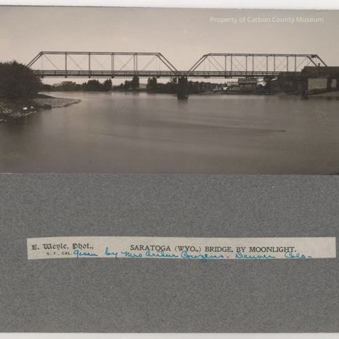 A long white thin sticker is placed at mat lower edge. Printed in black: E. Weyle, Phot, S.F. CAL Saratoga Bridge, by Moonlight