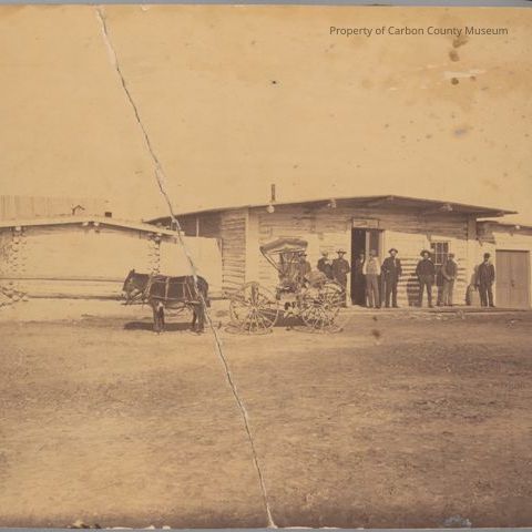 Warm Springs, Wyoming Post Office in 1887. The mail was delivered by a mule team that belonged to George Condict. W. B. Hugus, C. S. Miner, A.?, R. Couzens, George Folsom, Bob Edwards, Jim Cemmance.