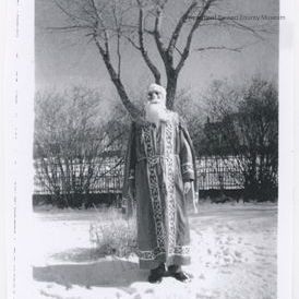 Black and white photocopy of a man standing outside in front a tree. He is dressed in a robe like costume and has a long white beard. There is snow on the ground. Written on the bottom in pencil "Mr. Patrick. Santa Clause Late 30's, early 40's. He is remembered by the donor as looking like Santa and playing Santa for the kids in Rawlins for many years.Collection