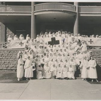 Black and white photo of many ladies wearing early white Red Cross Nursing uniforms and standing on the stairs of the Elks Building in Rawlins. The uniforms are white ankle length dresses with a white scarf over their hair with a red cross on the scarf. there is a large red cross flag in the center and one woman is holding a flag on the first row. There are two banners, one on each side which have crosses on them and the words Garment and Dressings. There is a second balcony on the Elks Building. There is a blue ink arrow pointing to one lady in the next to top row by the large cross. On the back of the photo " Byrde Robnett Ekdahl". This is a H. J. Rogner Photo, which is embossed in the right corner. The photos is in fair shape but the right edge is missing and there are bends and tears.Collection