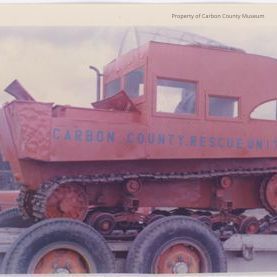 A color photograph of a Carbon County Rescue Unit. It is a red-orange machine with tracks and is resting on a trailer. It has black large letters on the side "Carbon County Rescue Unit". Written on the back in black ink: "Photo by". Stamped on the back in black: Harry S. Cashman District Manager Box 8 Rawlins, Wyoming Phone 324-3707. " Stamped in red: This is a Kodacolor Print made by Kodak October 1961 PAF. Condition is fair. This photo has been cut down to remove red tape. There are some scratches and dents.Collection