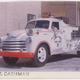 Color photo of a white with red trim and bumper fire truck. The truck has red lights on the roof and a large spot light on the hood. there are black hose or pipe along the side. Printed on the driver's door in gold: "Carbon County Fire Dept." Printed on the hood in gold: "Carbon County." The truck is parked in front of a brick building. Printed on the bottom of the photo in black: "Harry S. Cashman.