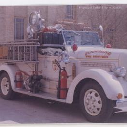 Color photo of a white fire truck with two fire extinguishers near the passenger door and a latter on the same side. There is no roof on the vehicle. There is a large spot light on the passenger side and two red lights on the hood of the vehicle. It is parked in front of a brick building.